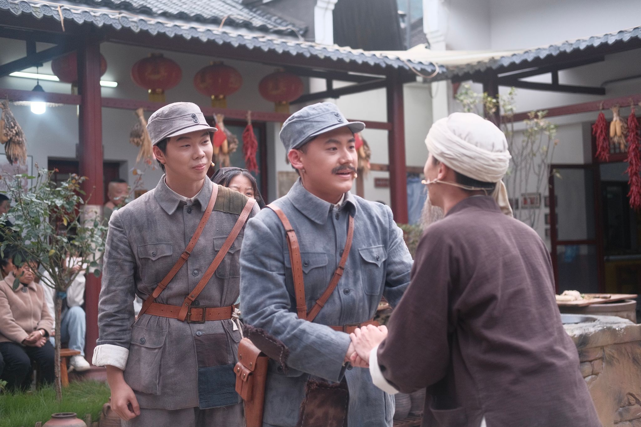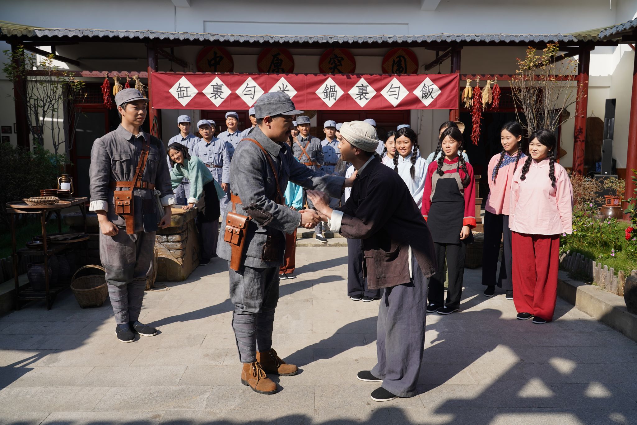 我校电影与电视学院表演系百余名学生担任该剧主演,以专业素养诠释角色魅力:演员通过贴花白胡须等细节造型,精准塑造“老村民”形象,言行举止生动还原革命时期民众特质;在中原军区大食堂场景中,演员以歌舞表演形式科普“马齿苋”“野菜饭”等革命时期生活元素,将军民鱼水情融入艺术表达;音乐响起时,演员主动牵手观众共唱红色歌曲,现场氛围温馨热烈,实现历史与现实的情感共鸣。