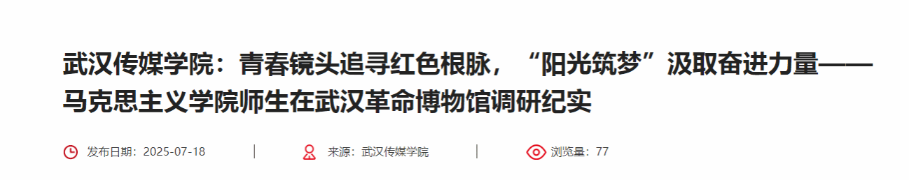 据悉,该团队后续将围绕此次调研素材,制作10分钟左右纪录片《红脉·城脉·人脉》,融合实景拍摄、动画还原、观众访谈。此次活动展现了新时代青年传媒人以专业之力活化红色资源的创新探索,彰显了武传学子“以专业赋能思想,用青春诠释信仰”的责任担当。