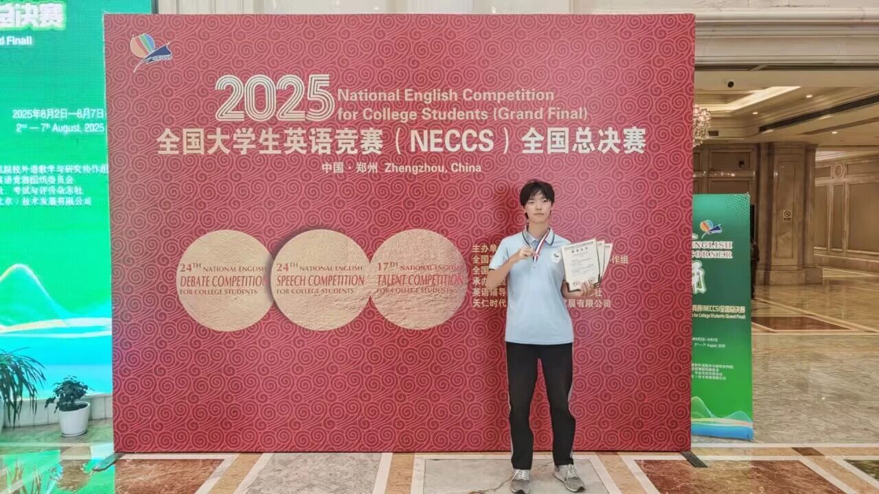 近日,2025年全国大学生英语竞赛全国总决赛在河南省郑州市举行,我校播音主持艺术学院2024级学生许维胜获得总决赛分赛事“第二十四届全国大学生英语演讲比赛”三等奖和“第十七届全国大学生英语风采大赛”优秀奖。此外,许维胜同学因在总决赛中表现优异,被评为“优秀参赛选手”。大学外语教研室教师左霞获评“优秀指导教师”。
